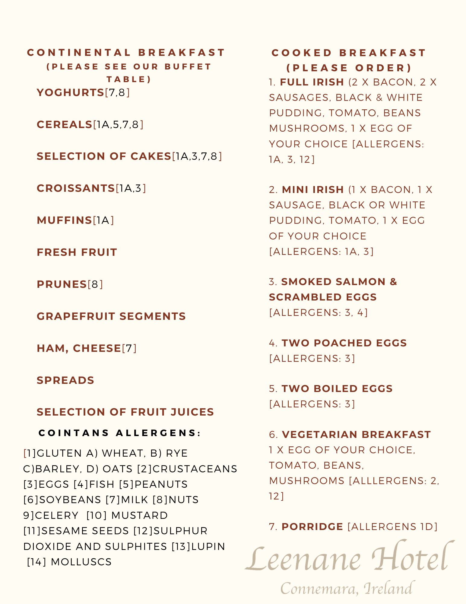 Our cooked breakfast menu includes favourites such as the Full Irish Breakfast, Mini Irish Breakfast, Smoked Salmon with Scrambled Eggs, Poached Eggs, Boiled Eggs, Vegetarian Breakfast, and tradictional Porridge.